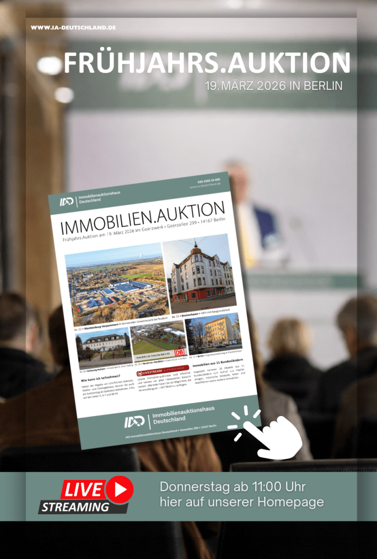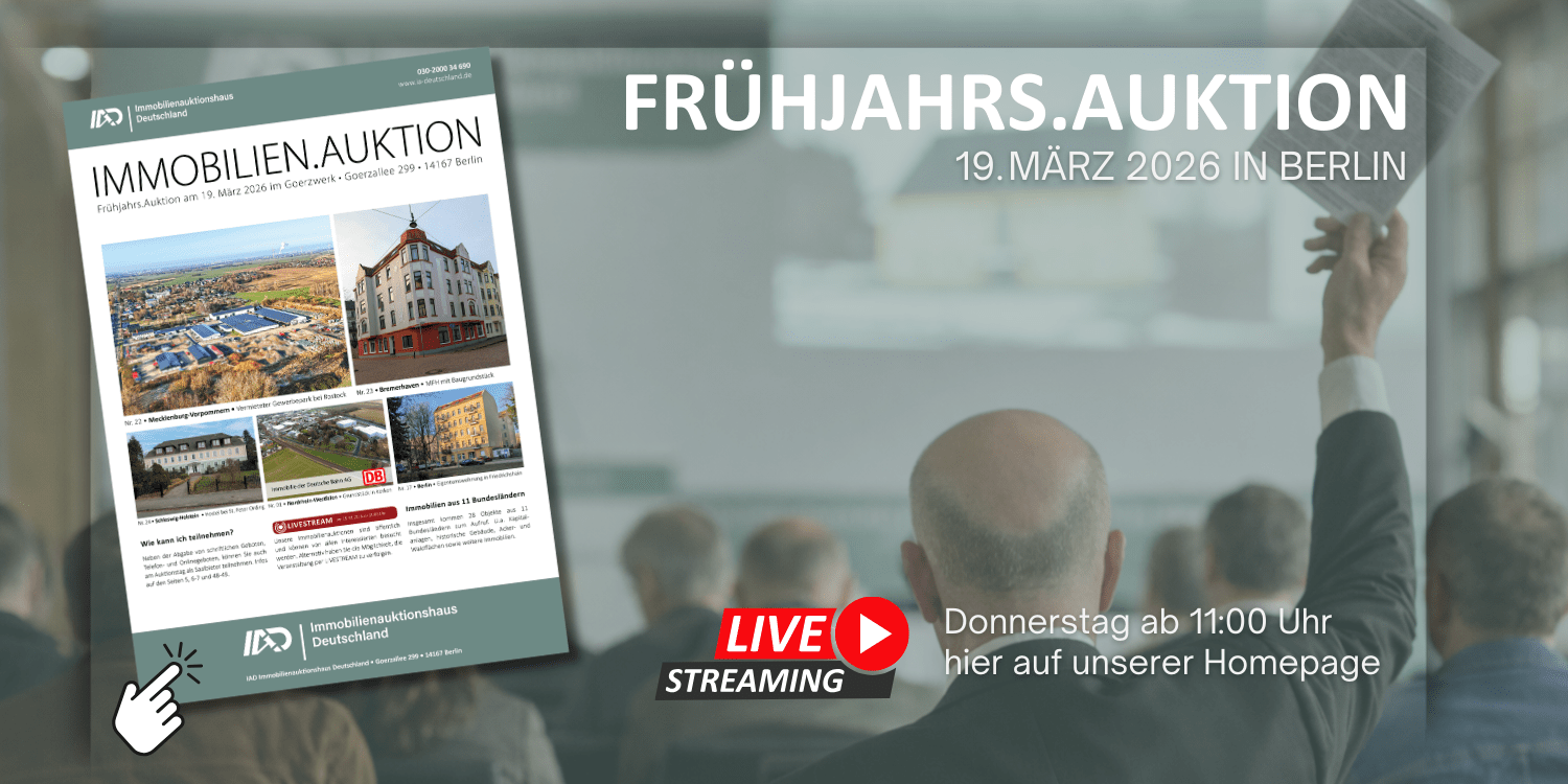 Die Immobilienauktionshaus Deutschland versteigert Immobilien jeglicher Art. Neben dem klassischen Einfamilienhaus versteigern wir auch Wohn- und Geschäftshäuser, Mehrfamilienhäuser, bebaute und unbebaute Grundstücke, Eigentumswohnungen, Gewerbeobjekte jeglicher Art, Sonderimmobilien wie Bahnhöfe, Bunker, Brücken und Schlösser. Ebenso Erbbaurechte sowie belastete und kontaminierte Grundstücke.