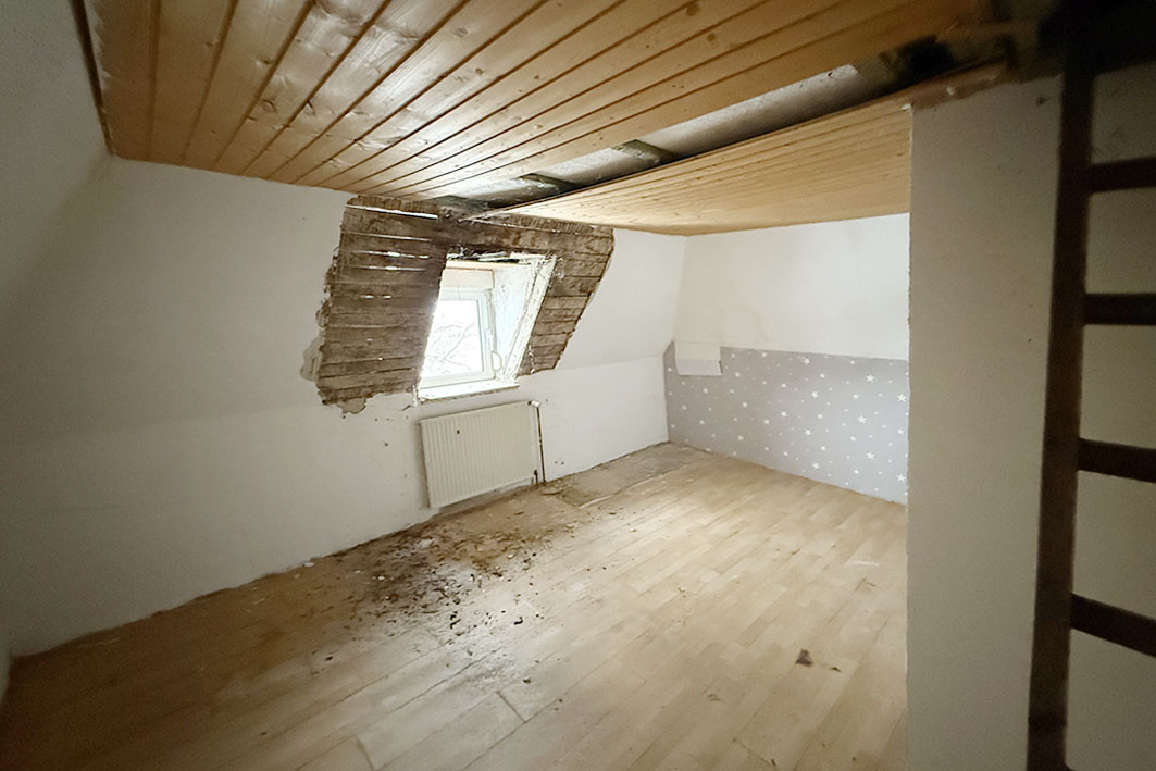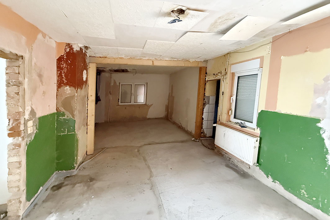 Doppelhaushälfte links, Bj. unbekannt, Klinkerbauweise, 1-geschossig mit ausgebautem Dachgeschoss, teilunterkellert, Kunststofffenster mit Isolierverglasung und Rollläden (tlw. defekt), Satteldach mit Blecheindeckung und Gaube, einfache Elektroinstallation, Sanitärausstattung überwiegend nicht mehr nutzbar, ehemals Beheizung über Gaszentralheizung mit Therme im Bad (nicht mehr funktionsfähig), Dach undicht, starke Feuchtigkeitsschäden, Schimmelbefall, tlw. Deckendurchbrüche, insgesamt stark sanierungs- und modernisierungsbedürftiger Zustand.