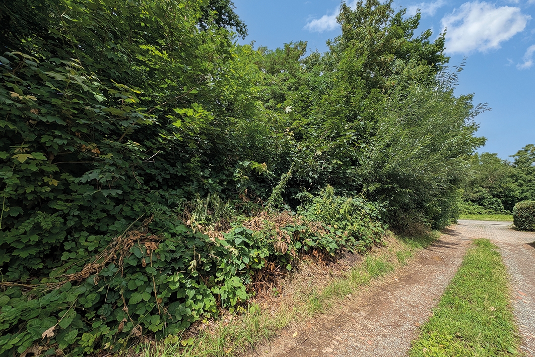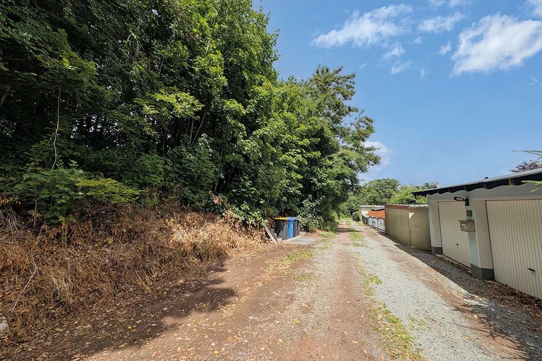Ungleichmäßig geschnittenes Grundstück, unmittelbar angrenzend an eine Siedlung mit gepflegten Einfamilienhäusern. Teilweise Hanglage und überwiegend mit Baum- und Strauchbewuchs. Das Grundstück erstreckt sich zudem über eine Straße, die als Zuwegung zu den angrenzenden Grundstücken dient. Diese Straße ist teilweise gepflastert und teilweise nicht befestigt.