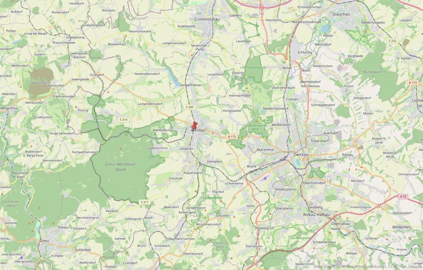 Die Große Kreisstadt Werdau, mit ca. 20.520 Einwohnern, ist in die Vorgebirgslandschaft des Vogtlandes und des Westerzgebirges eingebettet und wird geprägt von Bürgerhäusern, der Marienkirche und dem ansprechenden Rathaus. In ca. 15 Minuten erreicht man die Zwickauer Innenstadt und die beiden Städte Greiz und Reichenbach liegen jeweils ca. 20 Minuten entfernt.