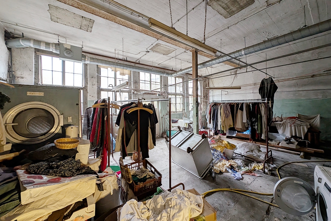 Gewerbeanbau, links Innenhof mit Garage, rechts Nebengebäude (ehem. Lagerfläche), Kesselhaus rechts am hinteren Anbau, links weiterer 2-geschossiger Anbau, rückwärtig weiteres Nebengebäude (ehem. chemische Reinigung) mit kleinem Innenhof.