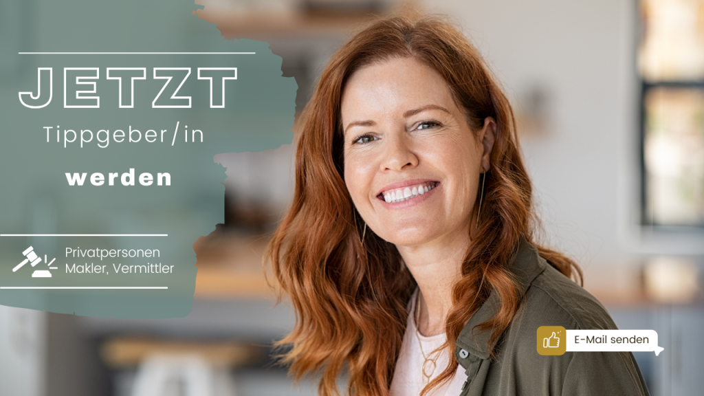 Geben Sie uns einen Tipp! Wenn die von Ihnen genannte Immobilie in einer unserer Auktionen erfolgreich versteigert wird, erhalten sie von uns eine Erfolgsprämie von bis zu € 5.000. Kooperationspartner (B2B) erhalten von uns bis zu 25 % Tippgeberprovision.